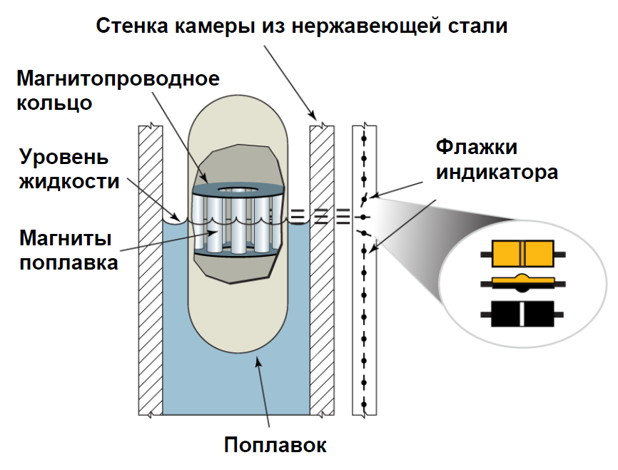 Изменение уровня жидкости в технологическом резервуаре приводит к такому же изменению уровня в камере. При этом поплавок со встроенными магнитами поднимается или опускается, приводя в движение флажки или челноки индикатора.