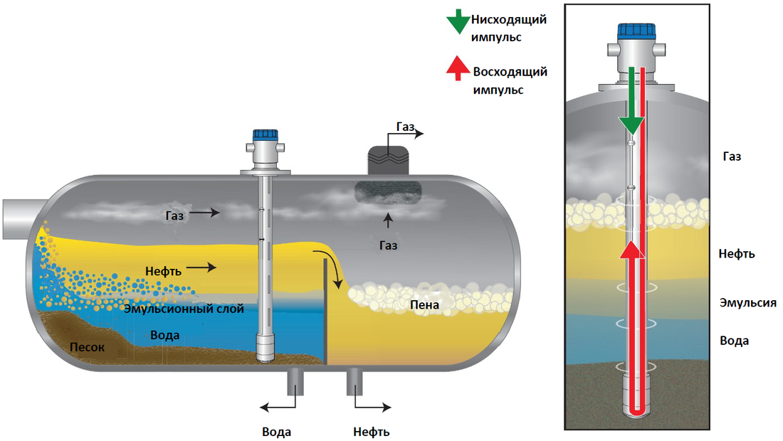 Обычно в волноводных радарных уровнемерах высокочастотные импульсы передаются сверху вниз и служат для определения верхнего (общего) уровня жидкости. В то же время Genesis посылает и восходящие импульсы для детектирования других границ раздела, которые могут присутствовать в резервуаре, включая верхний уровень эмульсионного слоя и его нижний уровень (уровень воды), а также уровень осадка.